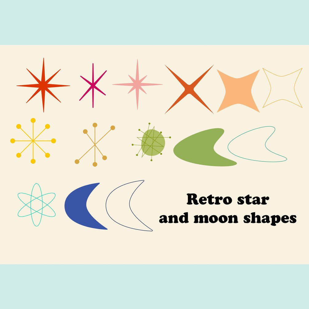 This 25 brush set features retro motifs such as starbursts, moons, atomic shapes, and other 1950's inspired icons. They are meant to be layered to create exciting shapes.