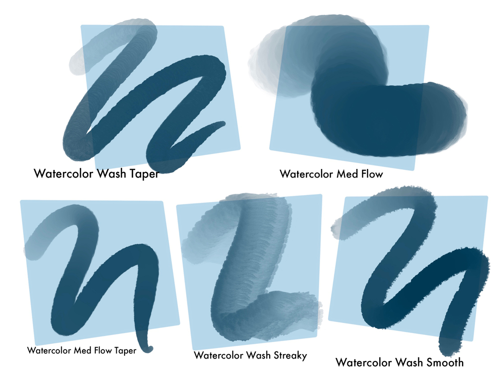 This set of 30 brushes mimics real watercolor paint and each brush was handmade from actual watercolor paintings.